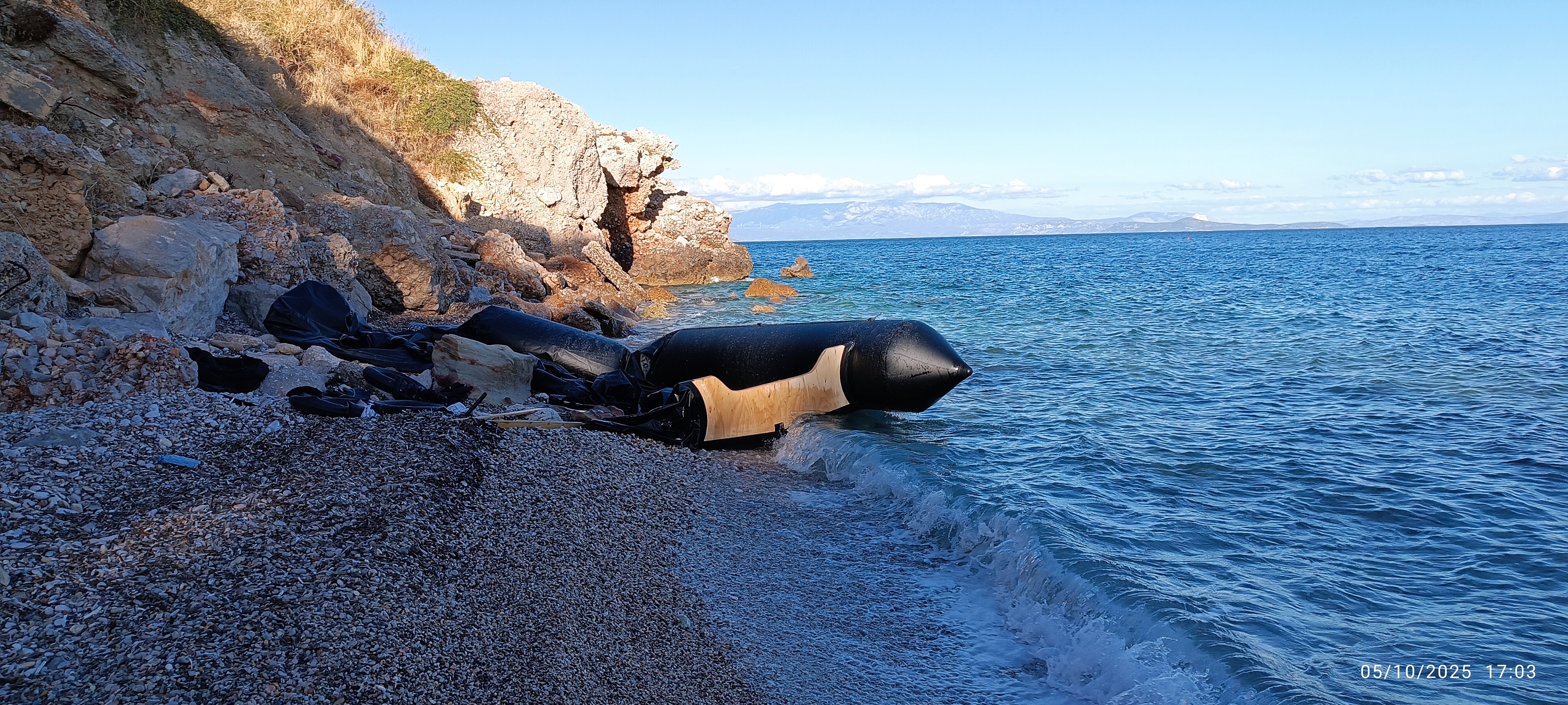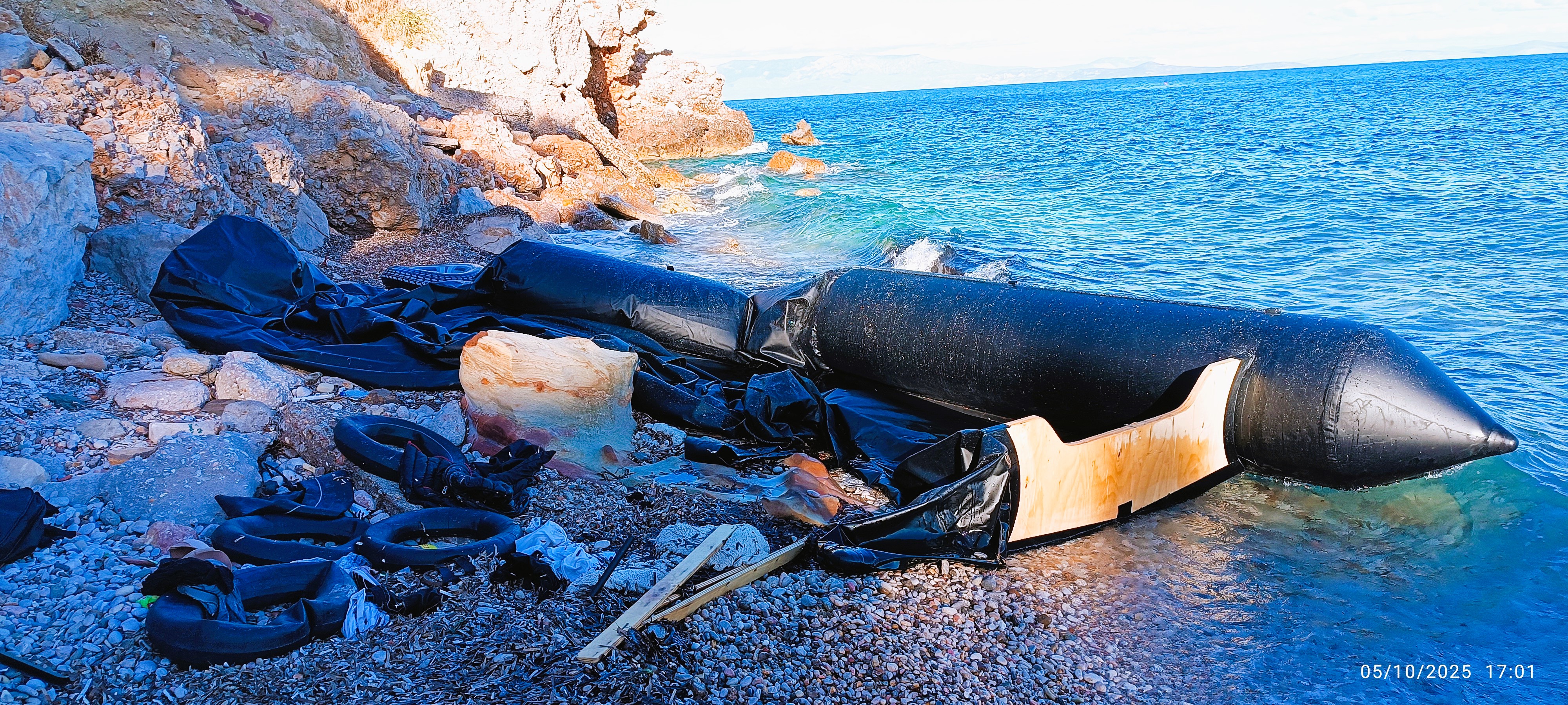 Φτάνοντας, λοιπόν, απόγευμα σε μία προσβάσιμη στο κοινό - αν και όχι τόσο τουριστική - παραλία αντικρίζω μία μαύρη φουσκωτή βάρκα αρκετά μεγάλη σε μέγεθος, που έχει αφεθεί εκεί που σκάει το κύμα. Γύρω της είναι πεταμένα σωσίβια, σαμπρέλες, τρόμπες, σακίδια, ρούχα και παπούτσια. Δεν γνωρίζω πόσο καιρό είναι εκεί η βάρκα γιατί είναι η πρώτη φορά που επισκέπτομαι την παραλία. Από το μέγεθός της και από το πλήθος των σωσιβίων και σαμπρελών, που βρίσκονται διάσπαρτα γύρω της, υπολογίζω ότι αυτή μετέφερε πάνω από 25 άτομα. Ξυπνάει μέσα μου ο Ηρακλής Πουαρώ και αποφασίζω να εξερευνήσω λίγο παραπάνω το «ναυάγιο». Προς απόδειξη όσων είδα, τράβηξα αρκετές φωτογραφίες με υδατογράφημα (ημερομηνία και ώρα), που συνοδεύουν το παρόν άρθρο.