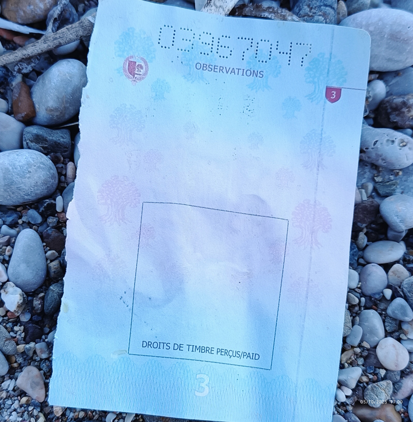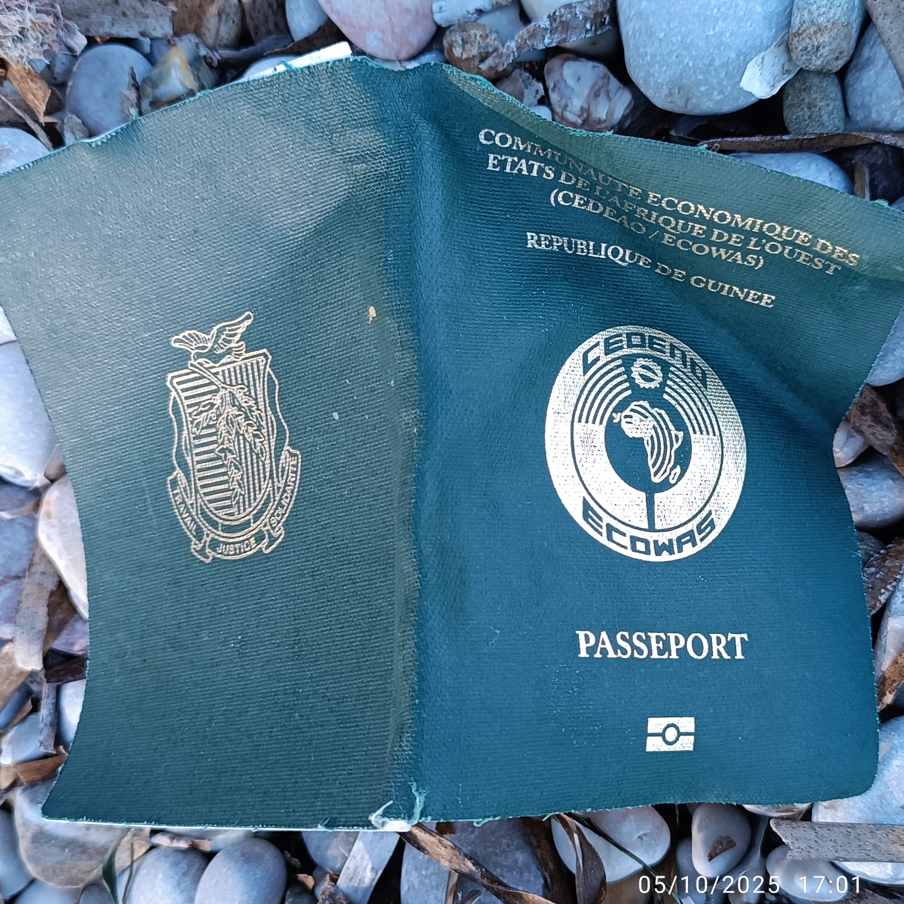 Πλησιάζοντας τη βάρκα βρίσκω το πράσινο εξώφυλλο ενός σκισμένου διαβατηρίου Γουινέας, αν βέβαια δεν είναι πλαστό. Επίσης, βρίσκω σκισμένα φύλλα άλλων διαβατηρίων, στα οποία φαίνεται ο διάτρητος αριθμός τους και γαλλικές λέξεις, αλλά είναι δύσκολο να καταλάβω ποιάς χώρας είναι. Πιθανολογώ ότι είναι από γαλλόφωνες χώρες της υποσαχάριας Αφρικής. Τα σωσίβια-γιλέκο έχουν έναν καρχαρία ως λογότυπο. Είναι μαύρα και όχι πορτοκαλί ή κίτρινα διότι σκοπός αυτών που τα φορούν είναι να φτάσουν μέχρι την ακτή χωρίς να εντοπιστούν. Οι σαμπρέλες είναι για λάστιχα αυτοκινήτων κατασκευασμένες στην Ινδία και στην Κίνα και σ’ αυτές αναγράφονται διάφορες πληροφορίες, μεταξύ των οποίων τα ονόματα των εταιριών που τις κατασκεύασαν.